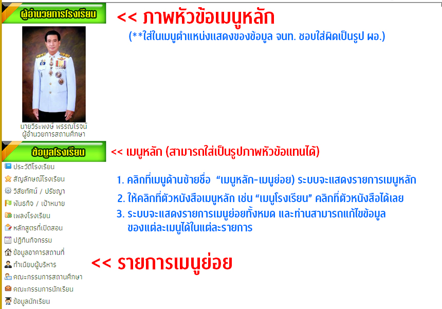 ภายในหัวข้อเมนูหลักเมนูย่อยนี้ จะมีข้อมูลพื้นฐานที่จำเป็นต้องแก้ไขที่สำคัญ เช่น ประวัติของโรงเรียน ข้อมูลนักเรียน เป็นต้น