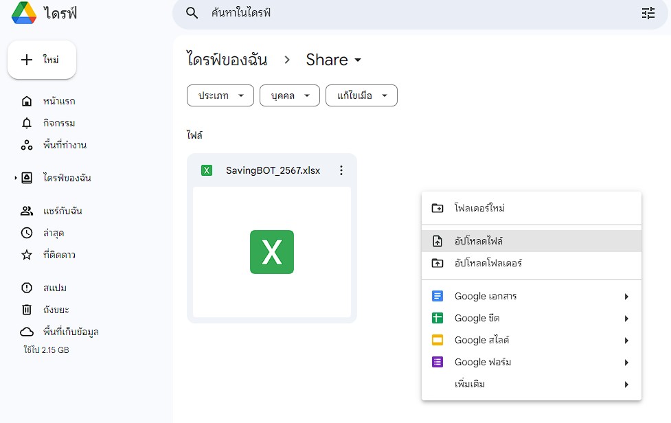1. ทำการอัพโหลดไฟล์ Excel ขึ้นไปยัง Google Drive ก่อนดังภาพ
