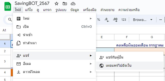 5. คลิกที่เมนู ไฟล์ แล้วกดเลือกแชร์ เลือก เผยแพร่ไปยังเว็บ ตามภาพ